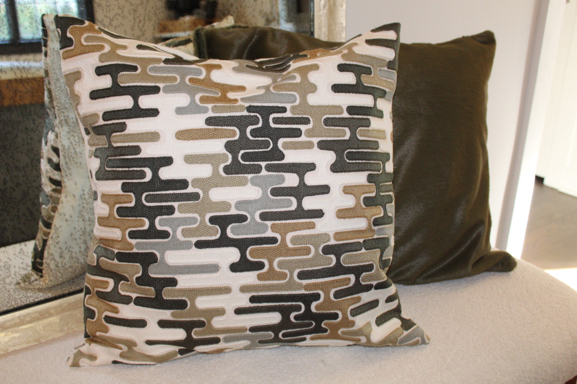 Update your home decor with our custom 20x20 pillows in a luxurious textile that exudes sophistication. Its soft mineral green tones bring a serene, calming presence to any room. Featuring a finely woven texture, this fabric blends subtle elegance with a refined, tactile quality. The understated pattern adds depth without being overpowering, making it a versatile choice for a range of interiors. Our custom pillows are designed with our premium fabrics on the front to highlight the unique design, while the back is crafted with a complementary neutral-toned fabric.
