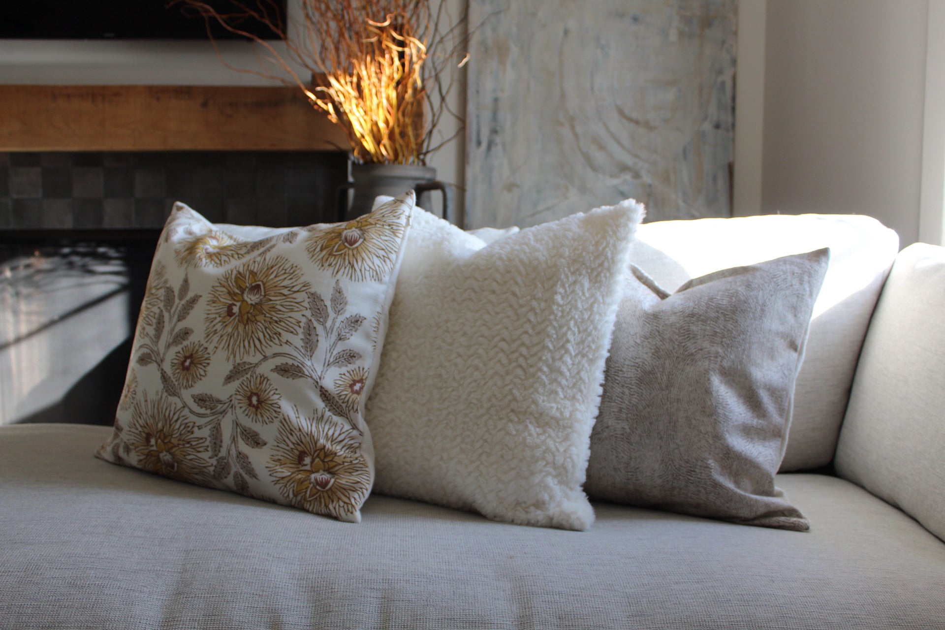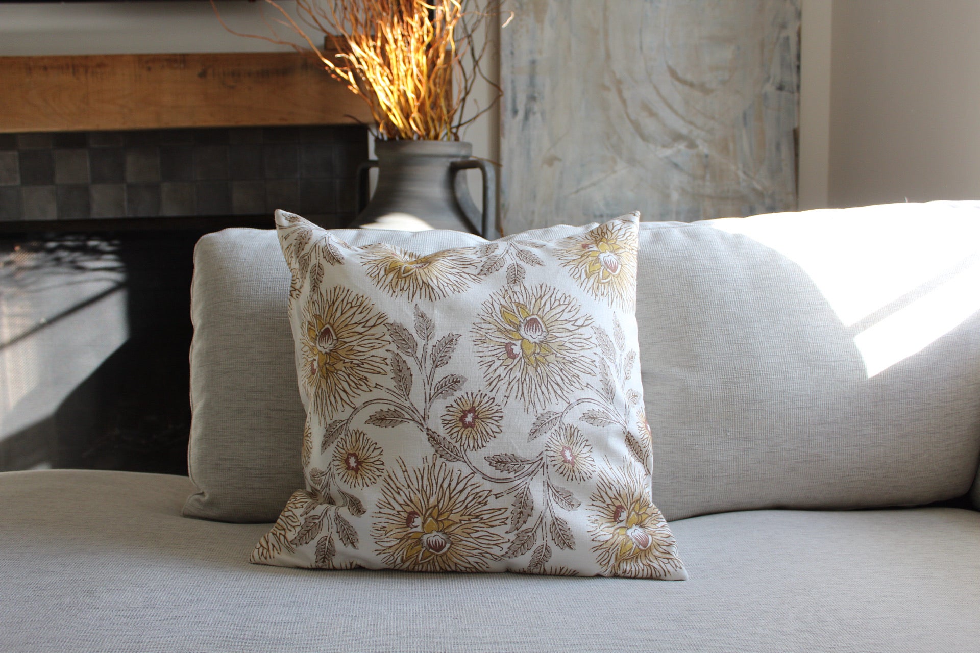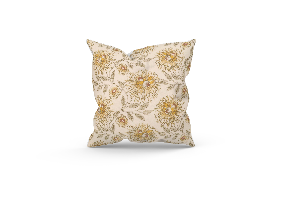 Transform your living space with our custom 20x20 pillows, meticulously crafted from a beautiful yellow block print fabric made of cotton blend. The vibrant, yet earthy tones bring a cheerful and welcoming energy to any room, while the fabric’s blend of fibers offers both softness and durability. The unique block print design adds visual interest and texture, making it a striking focal point. Each pillow is expertly made with the decorative fabric on the front to highlight the print, while the back is crafted from a complementary neutral-toned fabric for a polished, cohesive look.